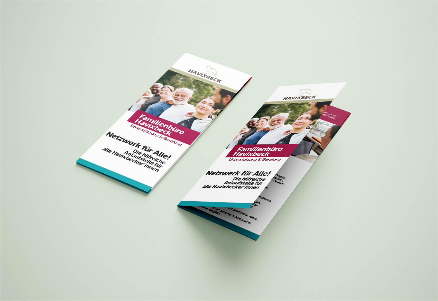 Das Familienbüro der Gemeinde Havixbeck wünschte sich einen Flyer, in dem alle Angebote kurz und knapp zusammengefasst werden sollten. Das Ganze sollte natürlich dem Corporate Design der Gemeinde entsprechen. Im Nachgang habe ich für das Familienbüro weitere Werbematerialien entworfen, die seitdem beim im Einsatz sind.